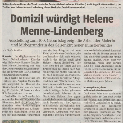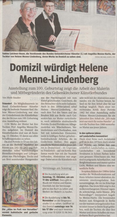 Gezeigt wird eine Retrospektive der Malerin Helene Menne-Lindenberg, sie war Mitgründerin des Bundes Gelsenkirchner Künstler 1950 und wäre nun 100 Jahre alt geworden. Ihre Tochter, Prof. Dr. Menne-Haritz, Vizipräsidentin des deutschen Bundesarchives a.D., Berlin, hat das Werk ihrer Mutter gesammelt und archiviert. Seit Ende 2017 wurde an der Ausstellung gearbeitet und auch eine Publikation, Helene Menne-Lindenberg (1919-88) Michael Imhof Verlag, herausgebracht.