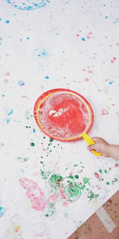 Traumhaft schön schwebten farbige Riesenseifenblasen durch den Raum und zerplatzten zu abstrakten Kunstwerken auf großen Papierbahnen. An einer zweiten Station stellten die Kinder selbst Traumfarben aus Naturmaterialien her, zermahlten Früchte, Blätter und Gewürze und verewigten die leuchtend schöne Farbenvielfalt der Natur auf Papier.